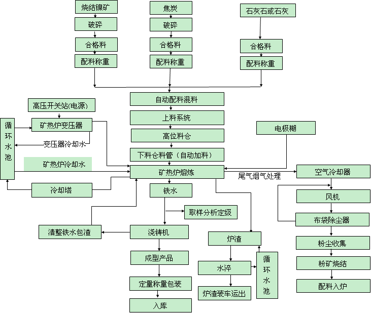 镍铁炉机械部分主要由炉壳体、半密闭式矮烟罩系统、压力环式电极把持器系统、短网系统、排烟系统、布料系统、下料系统、液压系统、气动系统、电炉冷却水系统等组成。辅助设备组成:烧结系统、配料系统、上料系统、出铁系统、浇铸设备、产品精整系统等。尾气净化回收装置选用大布袋旋风除尘装置。镍铁炉电气部分由高压系统(开关站)、低压系统、大屏幕监控系统及自动化控制系统组成。